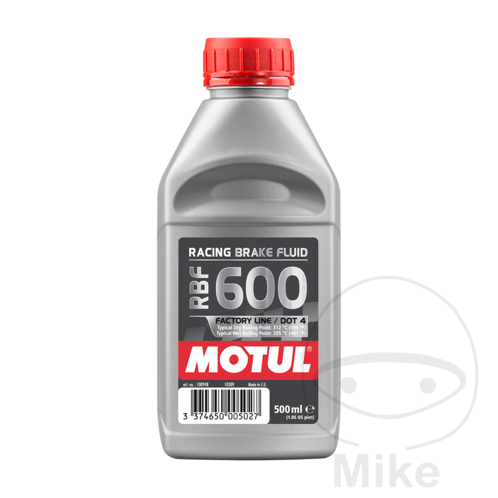 Motul RBF 600 Factory Line   MOTUL RBF 600 er en syntetisk bremsevæske, der er specielt beregnet til racerløb. Passer til alle bremsesystemer (stål- eller kulstofskiver), der i øjeblikket anvendes i racerløb. Kan ikke anvendes til vejkøretøjer!!!!   SPECIFIKATIONER / STANDARDER:STANDARDER: SAE J 1703ISO 4925 FMVSS 116 DOT 4   SÆRLIGE FORDELE / ANVISNINGER TIL ANVENDELSE:- Blandbar med alle DOT 3-, DOT 4- og DOT 5.1-produkter, men anbefales ikke- Blandbar med forgængeren MOTUL Racing Brake Fluid 600 og MOTUL HYDRAULIK RACING 300°C.- Væsken bør udskiftes mindst efter hvert andet løb, men senest efter 4 uger. - Luk omhyggeligt og opbevar den originale beholder for at forhindre fugtoptagelse.   ADVARSEL: Må ikke blandes med silikonebaserede bremsevæsker (DOT 5) og specielle væsker som f.eks. LHM. Væsken kan angribe køretøjets lak.   Egenskaber:Farve (visuelt) gulViskositet ved 100°C 2,5 mm²/sViskositet ved -40°C 1750 mm²/sTør kogepunkt 312°CVåd kogepunkt 205°C