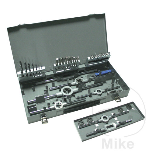 Threading værktøj sæt, 44 stk. indhold: Hånd haner af HSS i sæt i henhold til DIN (sæt af 3 stk) M3, M4, M5, M6, M8, M10, M12, skiftenøgle dette Runde Dies HSS DIN eller EN, M3, M4, M5, M6, M8, M10, M12, die holdere til dette formål spor 1 hvert 1. kernehullet spiralbor fremstillet af HSS ifølge DIN 338, rollforged Ø 2,5 / 3,3 / 4,2 / 5,0 / 6,8 / 8,5 / 10,2 mm 1 skruetrækker 1 metalkasse