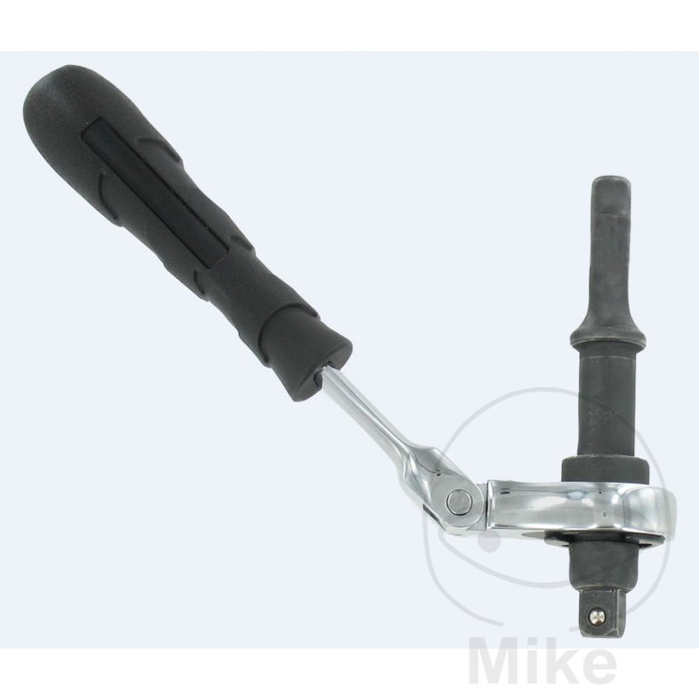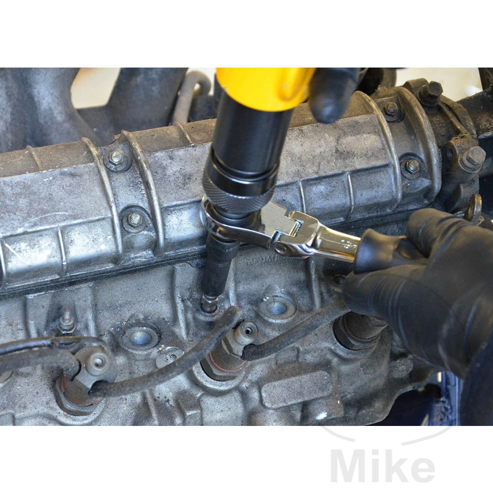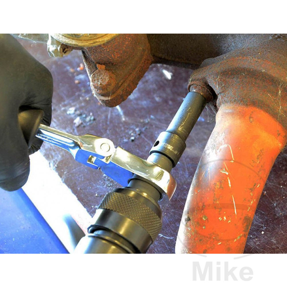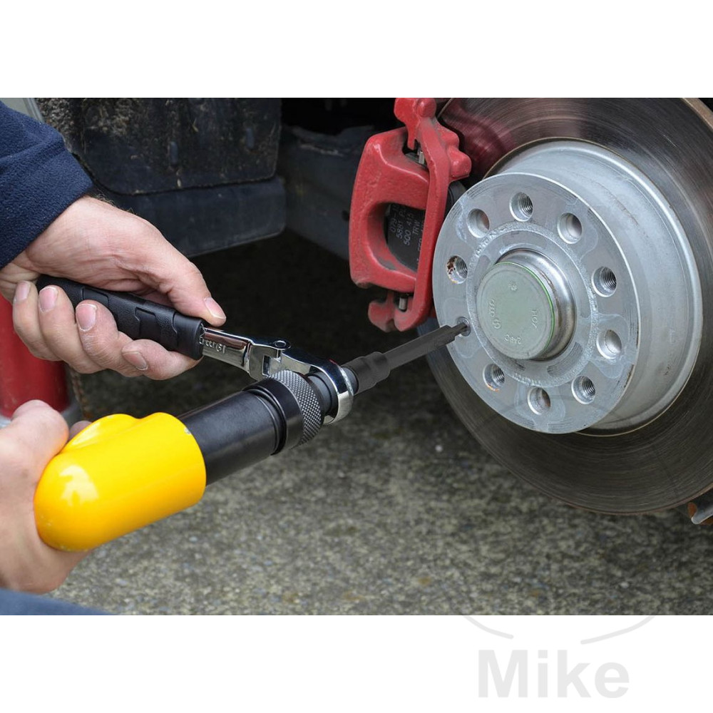 Fremgangsmåde: Placer strømadapteren i spånhammerens patron, indtil den låser. Sæt derefter det rette stik på adapterens firkant. Anbring derefter værktøjet på skrueforbindelsen, der skal løsnes, og aktiver forsigtigt udløseren på mejselhammeren. Mens du rammer, skal du bevæge skruenøglen lidt frem og tilbage for at hjælpe med at løsne den. Dette værktøj bruges blandt andet til demontering af gløderør, injektorer, lambdasensorer, alt at gøre med bremser og chassis, men også til alle andre tætte skrueforbindelser.
