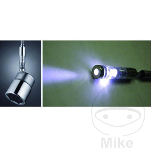 JMP teleskop magnetisk løfteren / jet setter med LED Med håndtag, der kan forlænges med clip LED lampe, inklusive batterier (3 stykker, se også reservedele) Sprøjtedyser til biler dorn (1,3 mm spray dyse indstilling) Længde: 183-680 mm Klæbestyrke 1,000 g Magnetiske tips Ø: 9 mm