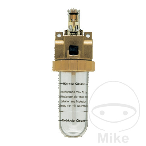 Mist oiler lige igennem DN 8 Hus fremstillet af trykstøbt zink, beholdere af plast (polycarbonat). Olie kan genfyldes under pres muligt. Nåleventil efter olie måling med høj drop konstans over lange perioder. Tilslutning: G 3/8 Pres max:. 16 bar : 0 ° C til 50 ° C Strømningshastighed ved 6 bar driftstryk: 70 m³ / h Dimension (Ø x H): 56 x 170 mm Størrelse: DN 8 Effektiv skål volumen: 40 cm Reservedele: Plastbeholdere med forsegling lukket,