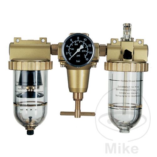 Vedligeholdelse DN 15   Med plastbeholdere og manuelt dræn, med manometer.   Tilslutning: G 1/2 Reguleringsområde: 0,5 til 10 bar Pres max:. 16 bar : 0 ° C til 50 ° C Strømningshastighed ved 6 bar driftstryk: 110 m³ / h Dimension (Ø x H): 281 x 1117 mm Størrelse: DN 15 Afhængighed forsyningstryk: <2% Effektiv skål volumen: 80 cm Brugbar olietank kapacitet: 135 cc